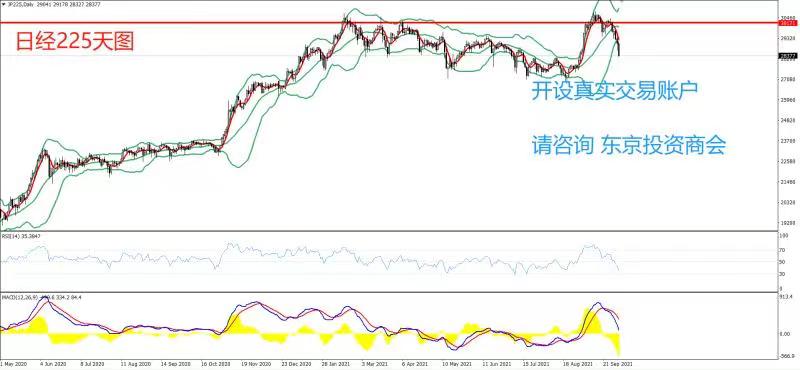从技术分析的角度,日经指数上日继续下行表现,价格持续在布林带中轨与下轨之间运行,汇价有效下破了前期重要支撑29000一线,天图级别布林带横盘缩口,布林带中轨横盘运行。