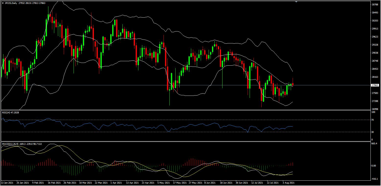 从技术分析的角度,日经225价格上日突破天图级别布林带中轨,天图级别布林带上下轨开始缩口,布林带中轨向下偏折。