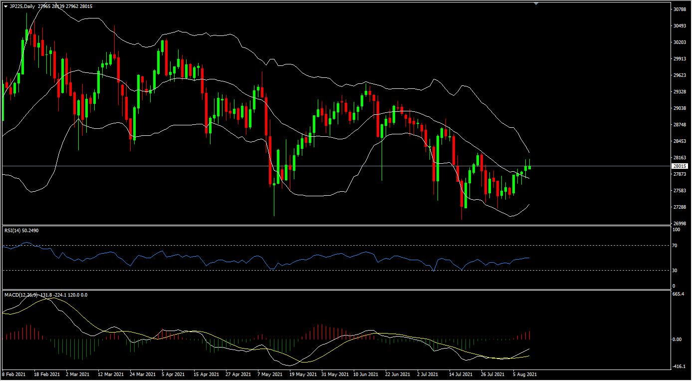 从技术分析的角度,日经225价格连续4天收阳线,K线在天图级别布林带中轨与上轨之间运行,天图级别布林带上下轨开始缩口,布林带中轨向下偏折。