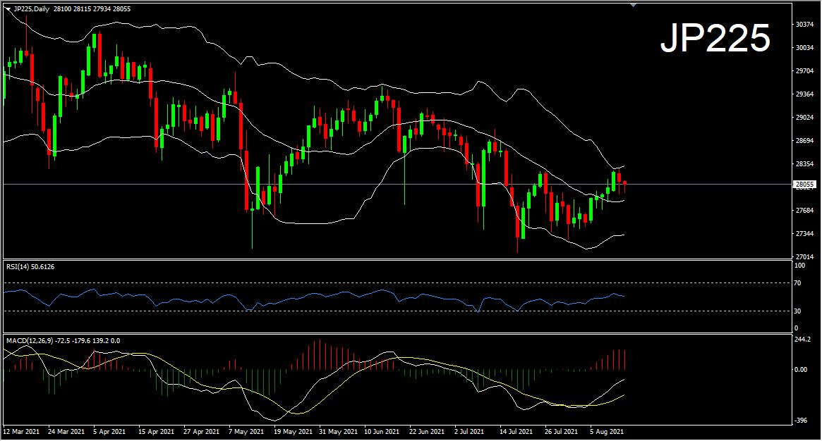 从技术分析的角度,日经225价格触及天图级别布林带上轨后反弹下跌,天图级别布林带上下轨微张,布林带中轨偏折向上。