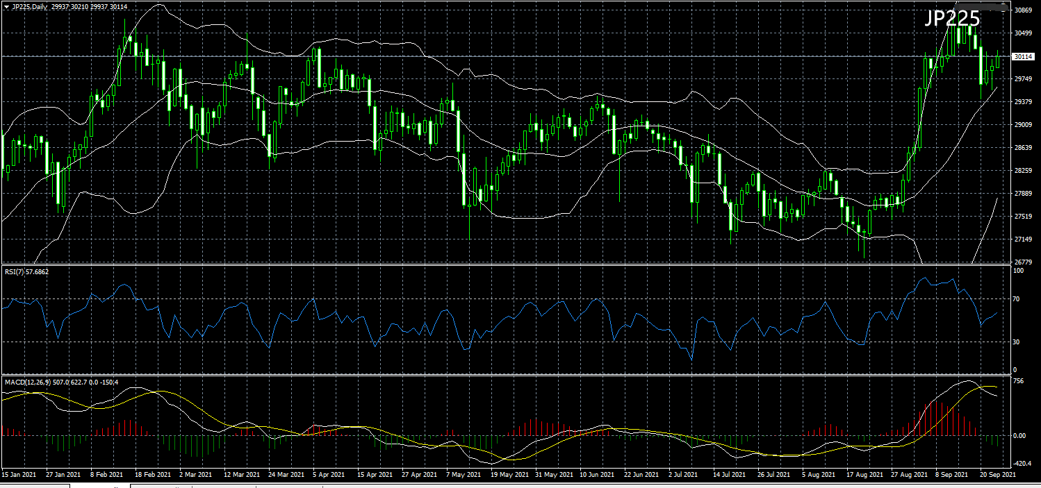 从技术分析的角度,日经价格上日继续围绕前期重要阻力位30000一线展开多空争夺,汇价在经历了前期连续3个交易日收阴线后,上日与上上日继续收阳。天图级别布林带向上开口,布林带中轨向上偏折。