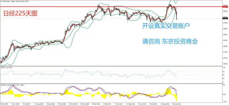 从技术分析的角度,日经指数上日继续下行表现,连续3个交易日收阴线,价格持续在布林带中轨与下轨之间运行,汇价有效下破了前期重要支撑29000一线,天图级别布林带横盘缩口,布林带中轨横盘运行。