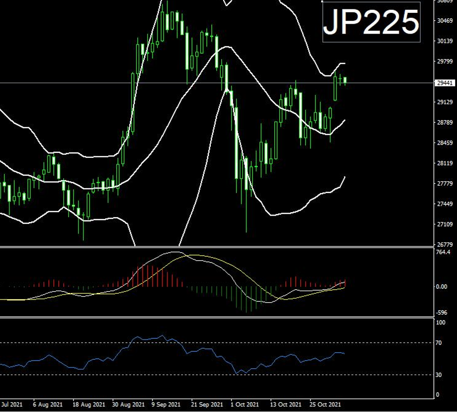 从技术分析的角度,日经价格上日K线收十字星形态,持续在布林带中轨之上运行。日线级别布林带三轨并行向上。