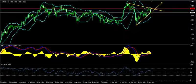 日经价格上日继续受布林带上轨阻力位影响,价格一度回调至布林带中轨,接近29140一线支撑。29140一线支撑是否有效,值得各位交易者密切观察。日线级别布林带开口向上。