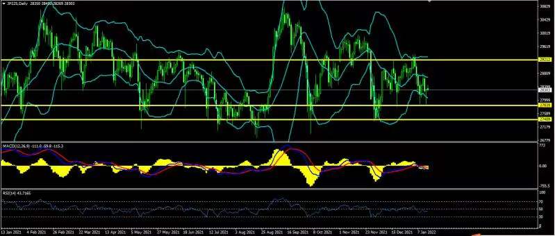 日经价格上日受压于中轨继续下跌,未能成功突破中轨上涨。日经价格仍在区27400-29200,多空争夺战仍未结束。目前多头市场收到打压,空头市场逐渐占据上风,日线级别布林带开口向下。