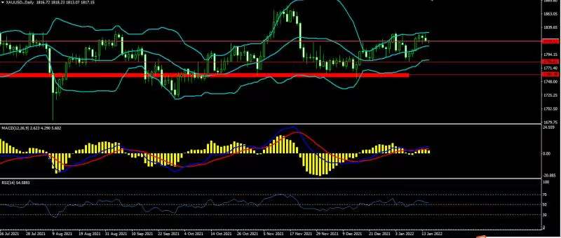 黄金上日开盘1825.0,最高1828.1,最低1812.8收盘1822.5