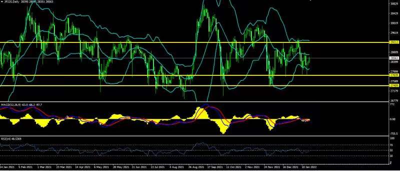日经价格上日在27840一线附近获得支撑继续向上反弹,未能成功跌破近期低点。日经价格仍在区27400-29200,多空争夺战仍未结束。目前多头市场任然受到到打压,空头市场占据上风,日线级别布林带收口三轨较为平缓。