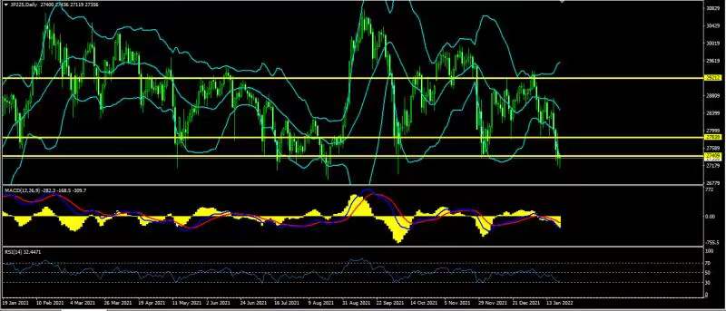 日经价格上日布林带中轨受阻后继续暴跌,且下穿27400一线重要支撑位,目前日经价格在27400重要支撑位附近运行,今日建议继续观察能否成功突破27400重要支撑位。目前多头市场任然受到到打压,空头市场占据上风,日线级别布林带向下开口。