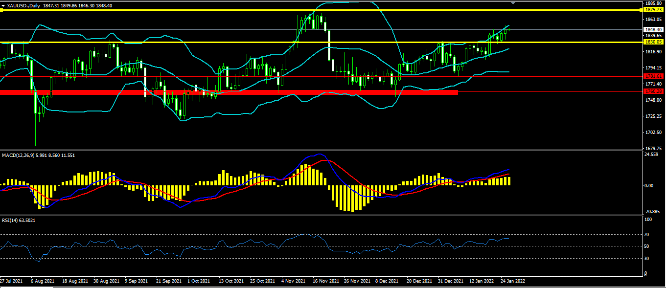 黄金上日开盘1842.3,最高1853.8,最低1834.6收盘1847.5