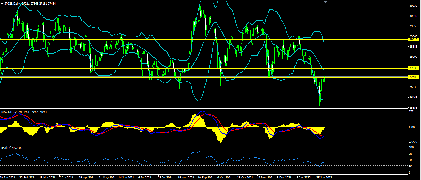 日经价格上日成功跌破27400一线重要支撑位继续第一波向上回调,但未能回到27400一线阻力之上。空头市场依旧占据主要市场,今日继续向上回调的可能性较大,今日建议观察中轨27700一线压力位,继续以逢高做空的思路为主,日线级别布林带向下开口。