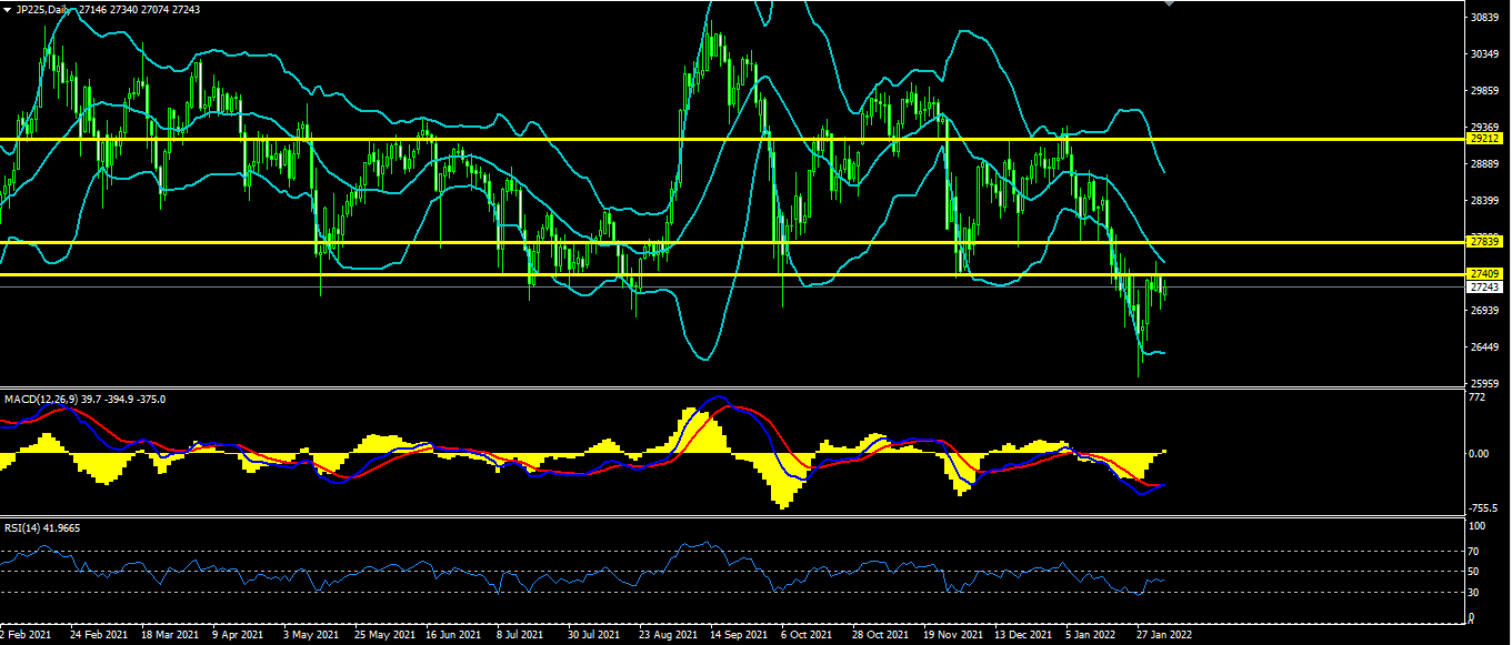 日经价格第一波向上回调后受阻于布林带中轨继续下行,最终收盘于27400一线阻力之下。空头市场依旧占据主要市场,今日有可能继续下跌。建议继续以逢高做空的思路为主,日线级别布林带向下开口。
