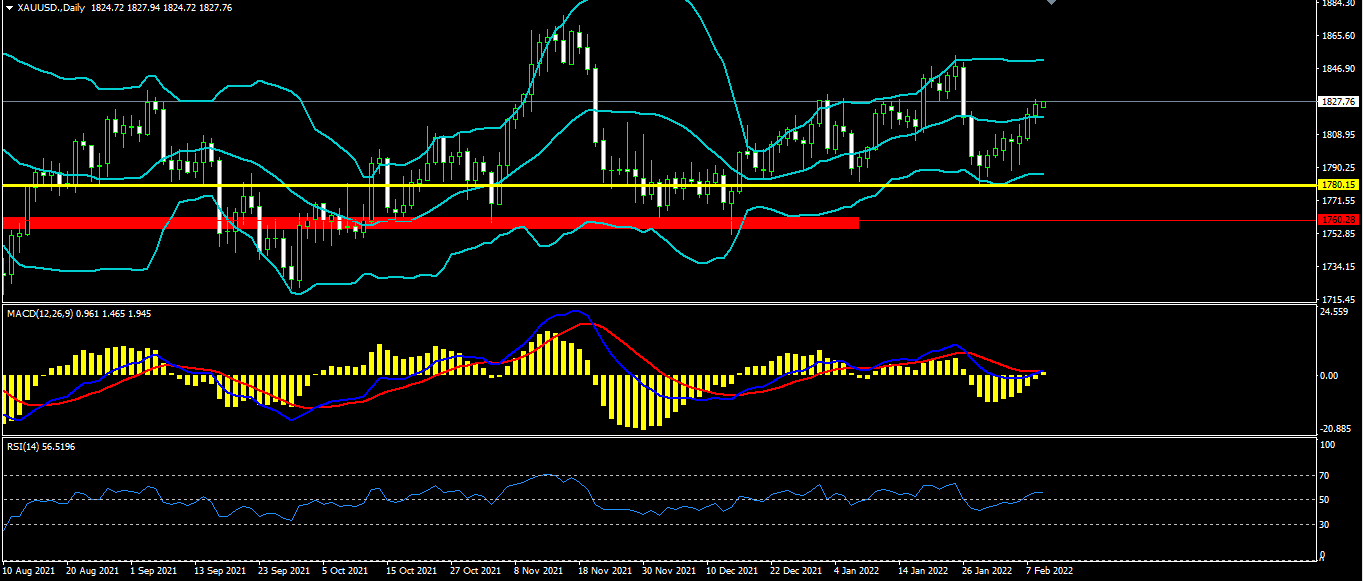 黄金上日开盘1820.0,最高1828.8,最低1815.5收盘1826.0