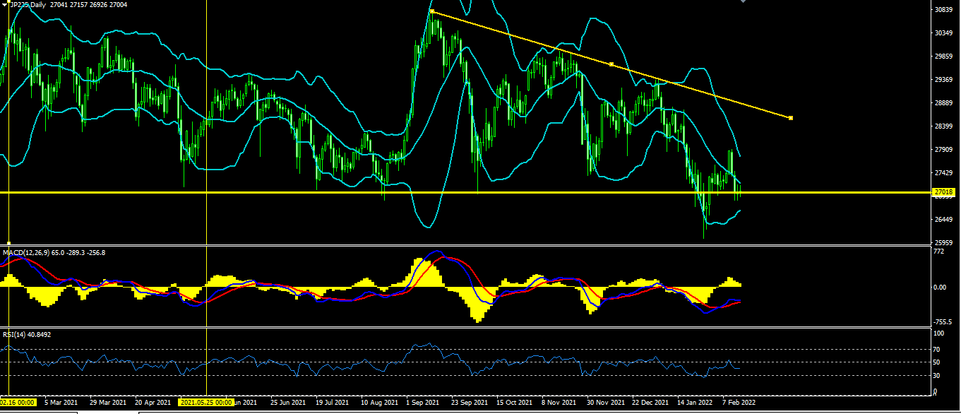 上日日经价格受日银无限制买入国债,导致日经略微上涨,但价格依旧在中轨之下。空头市场依旧占据主要市场。今日建议继观察27000一线支撑是否有效,日线级别布林带收口向下。