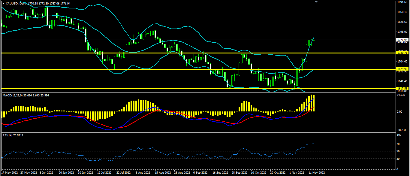黄金上日开盘1762.8,最高1775.0,最低1753.2收盘1771.6