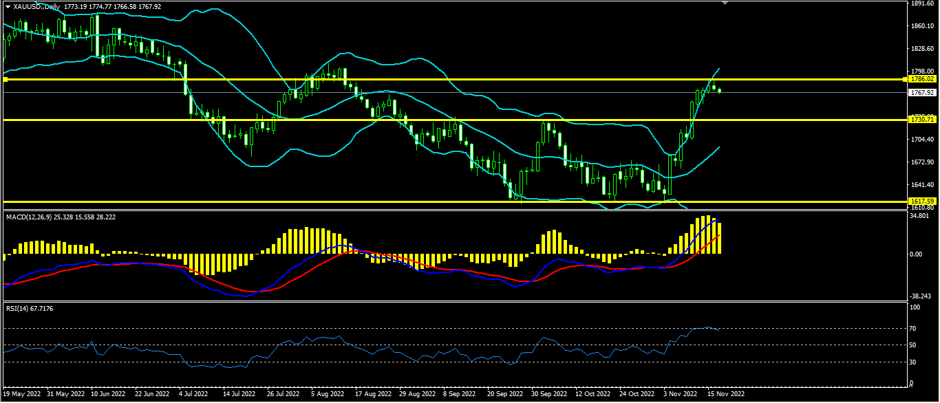 黄金上日开盘1778.0,最高1784.8,最低1770.0收盘1773.2