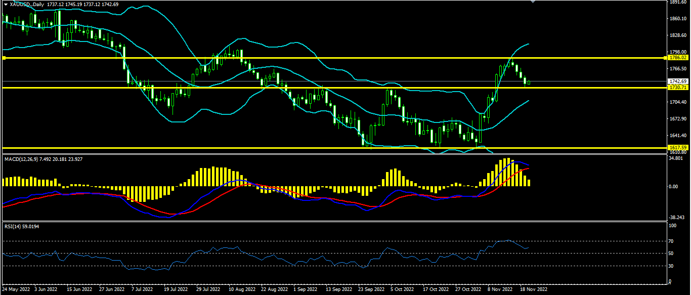 黄金上日开盘1749.6,最高1752.9,最低1732.3收盘1738.5