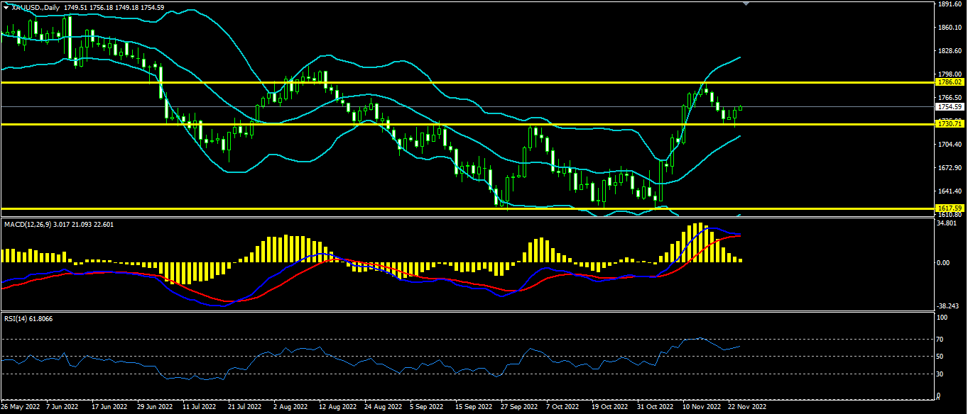 黄金上日开盘1739.5,最高1753.4,最低1726.5收盘1749.5