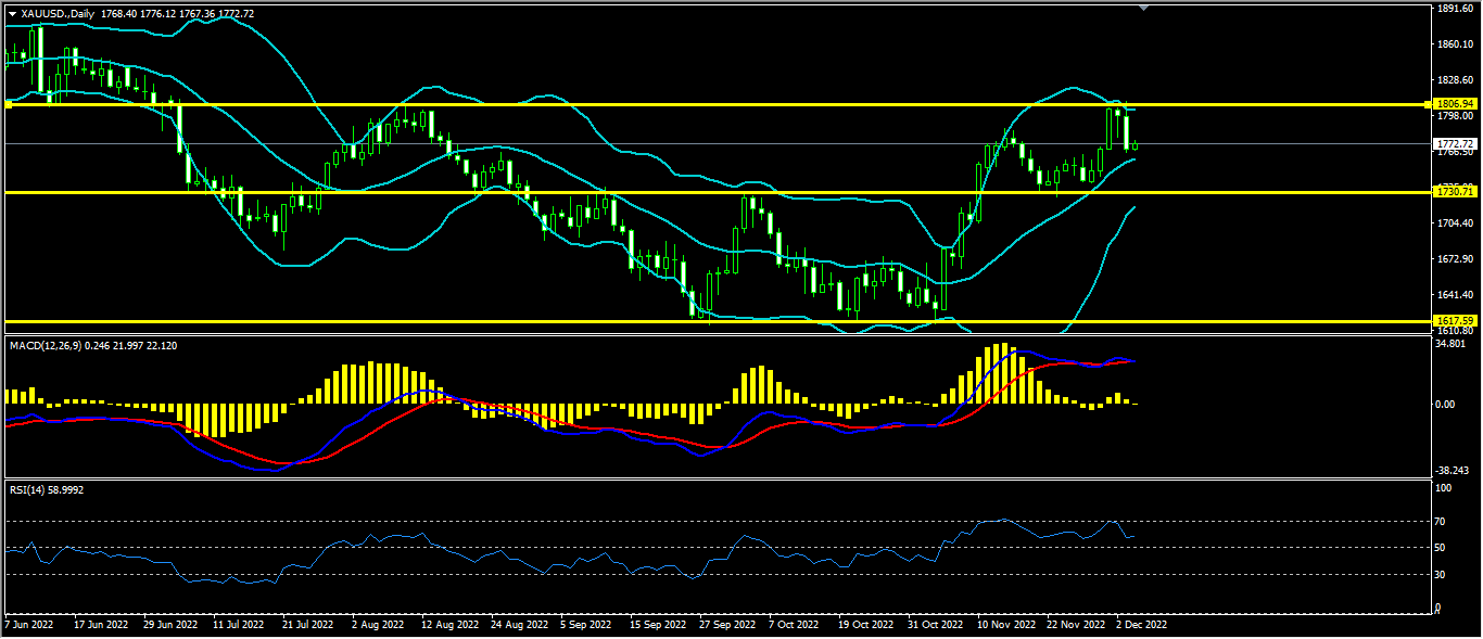上日黄金价格受阻于1806一线阻力影响,向下回调,未成功上破1806高点,最终收阴。价格跌至布林带中轨。布林带向上开口,看涨。