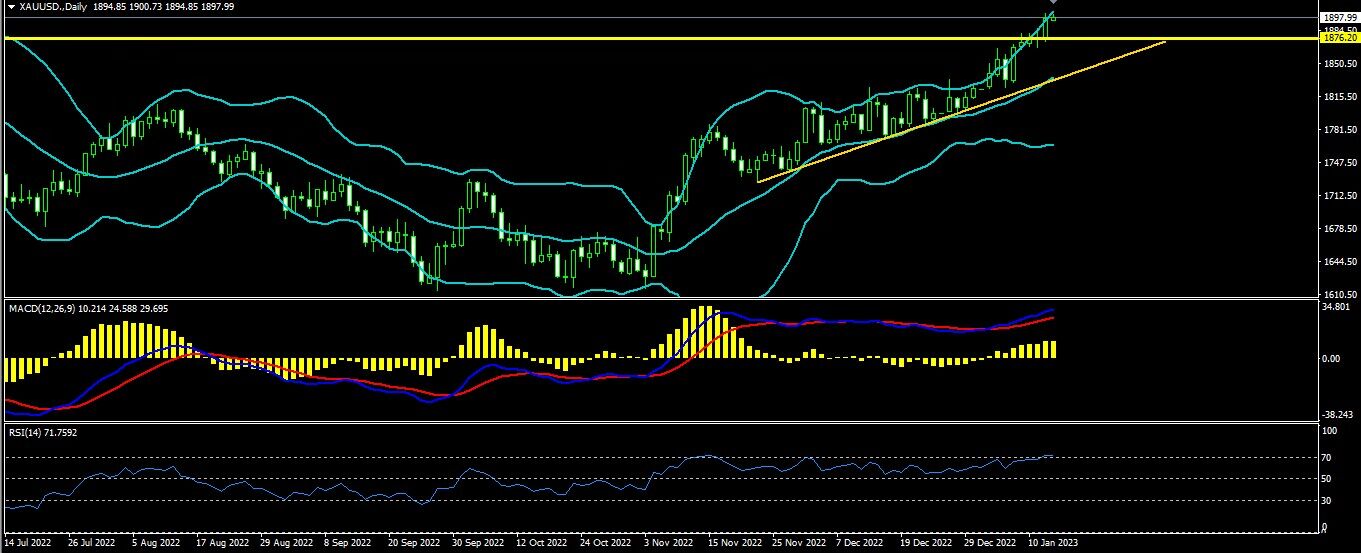 黄金上日开盘1875.4最高1901.6最低1873.4收盘1897.2